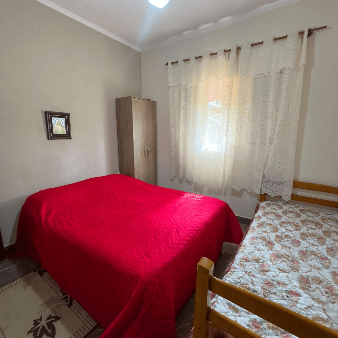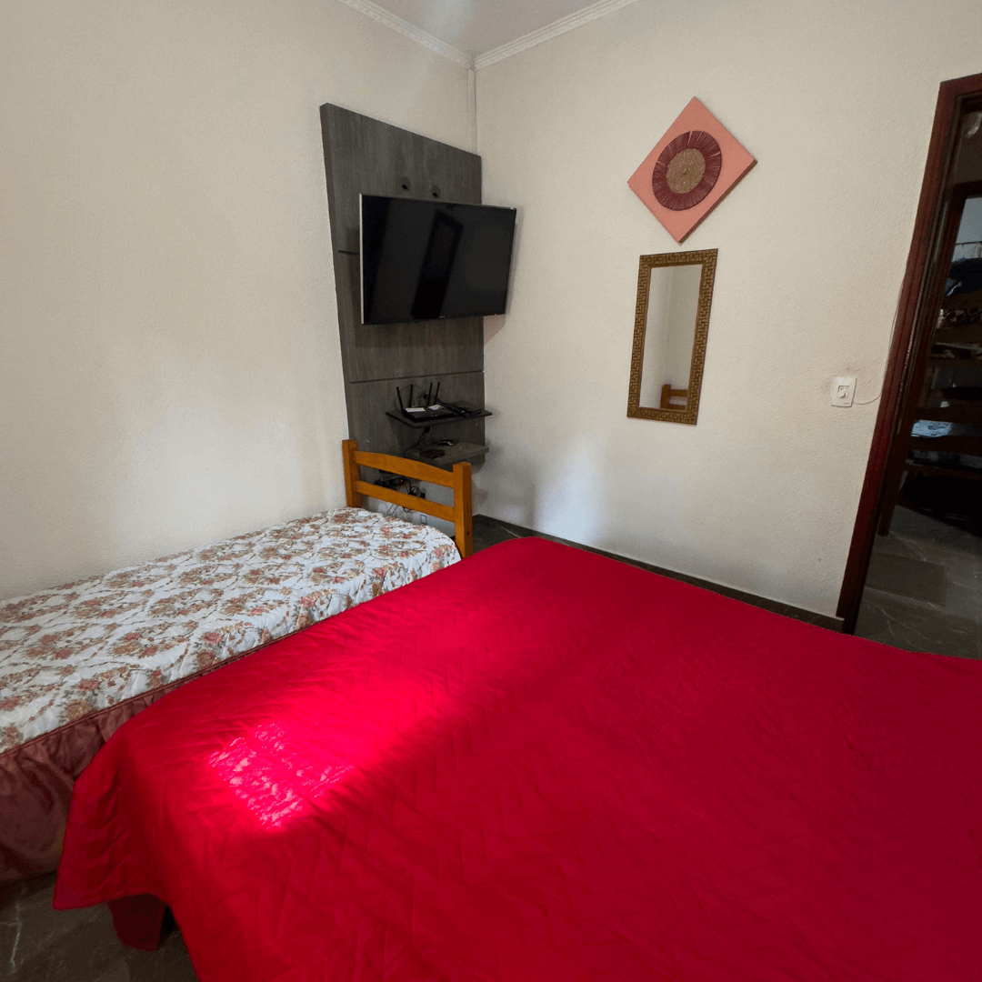 São 3 quartos equipados com TV e ventilador de teto, sendo 1 cama de casal, 2 camas de solteiro, 3 beliches e mais 10 colchões avulsos.