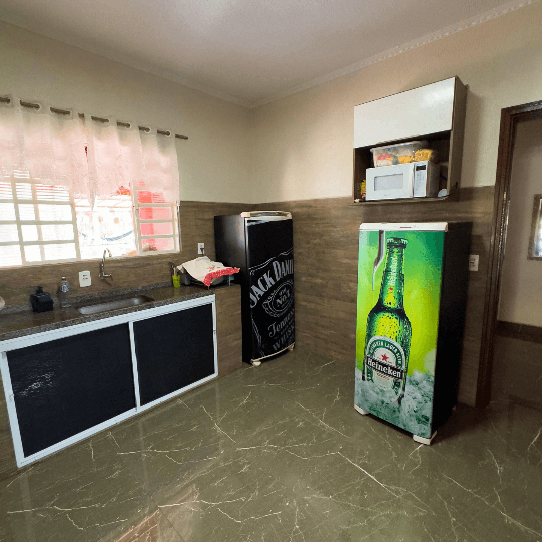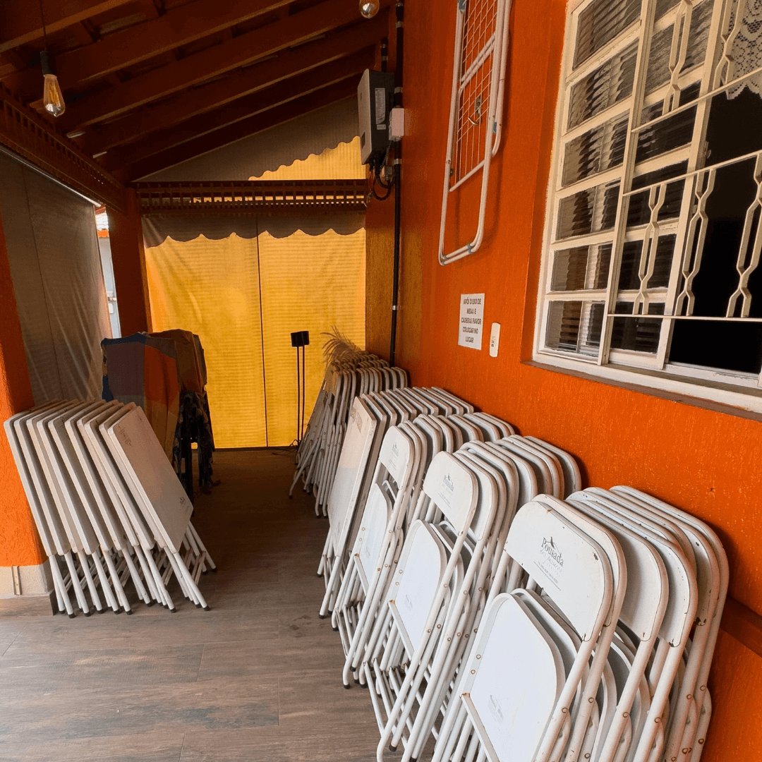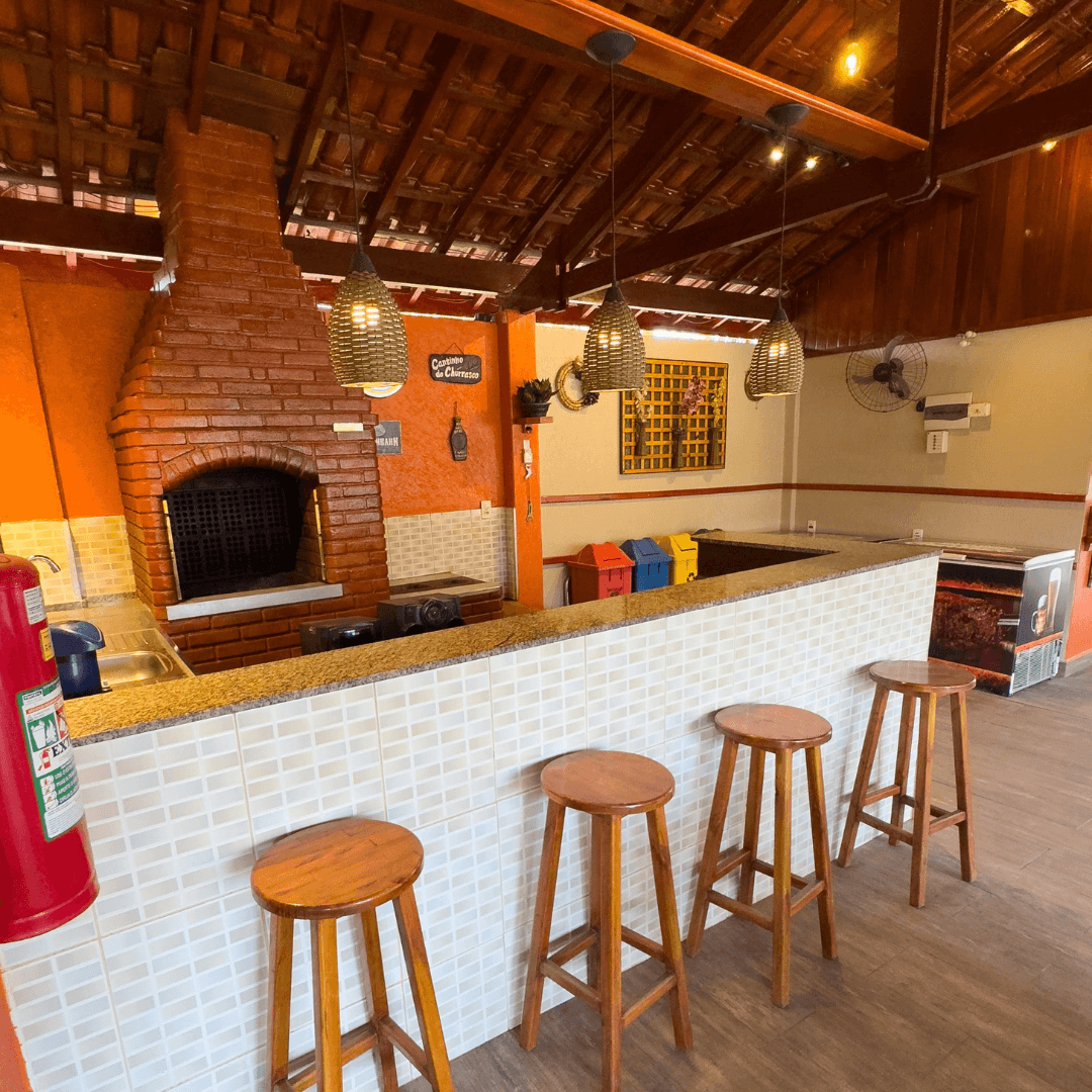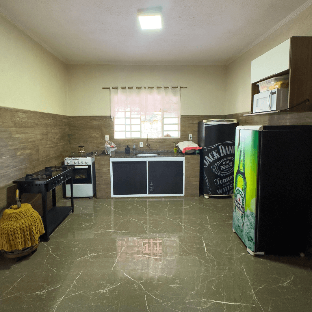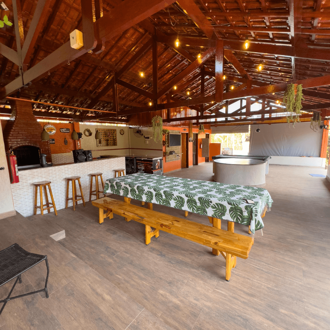 Na parte gastronômica, o espaço oferece churrasqueira, fogão a lenha, fogão convencional, micro-ondas, 2 geladeiras e 2 freezers, além de mesas e cadeiras.