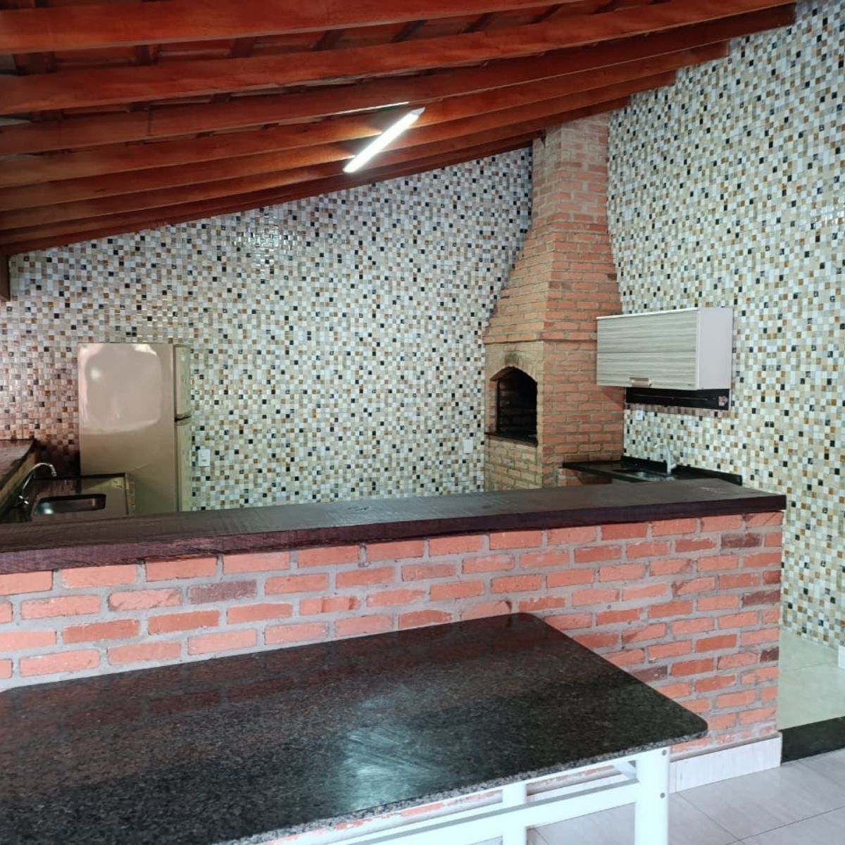 2 mesas grandes (1 de madeira e 1 de granito – ambas com aproximadamente 2m)